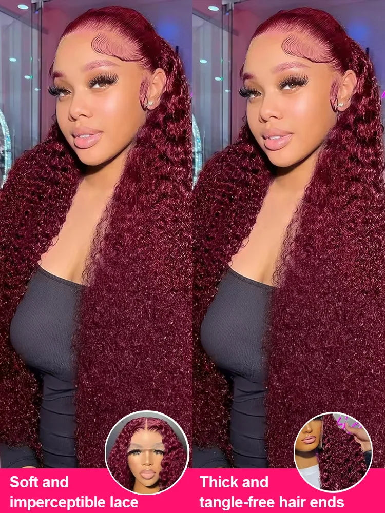 Encharm 13X4 Transparent Lace 99J Burgundy Color Burmese Curl Wig 180% Density Human Hair