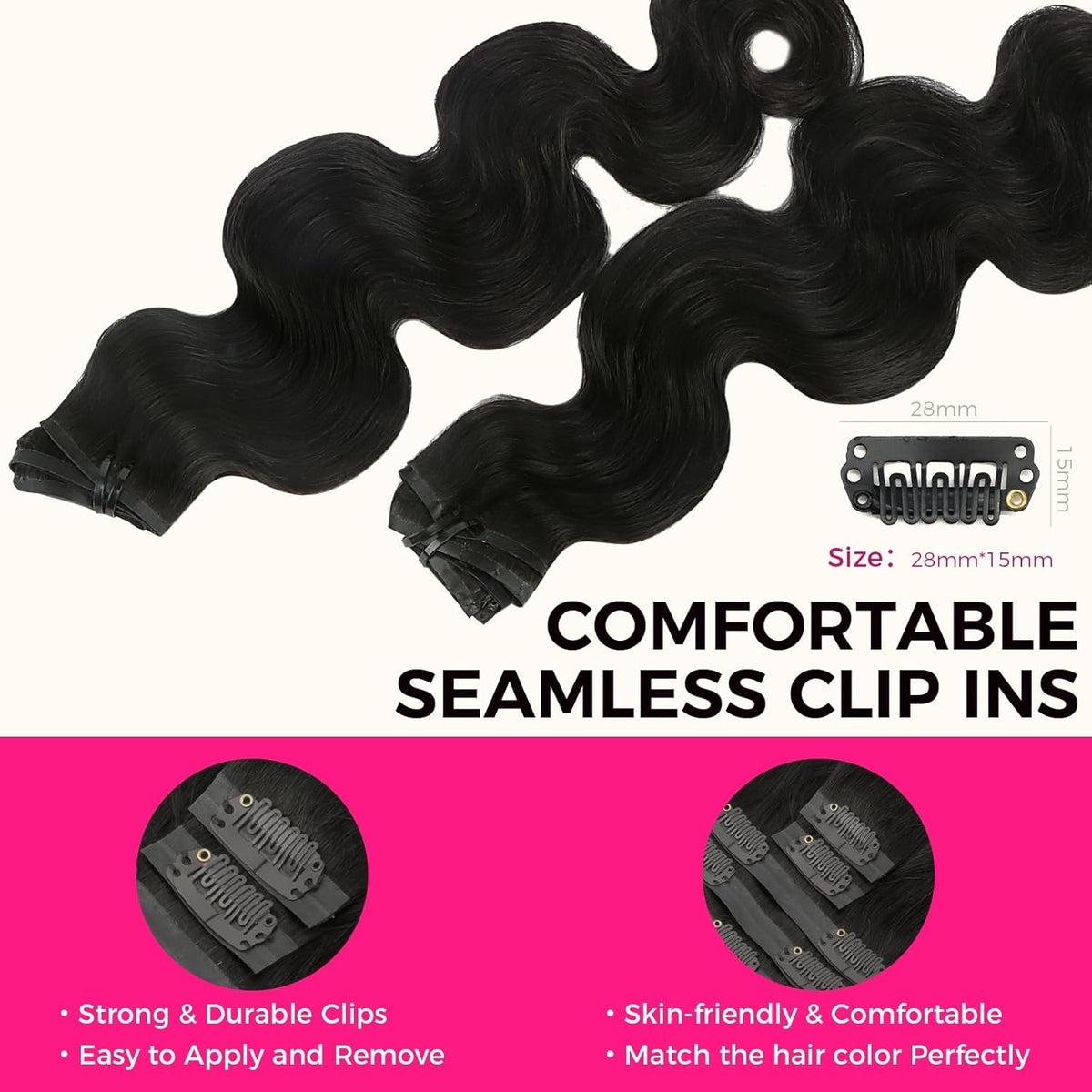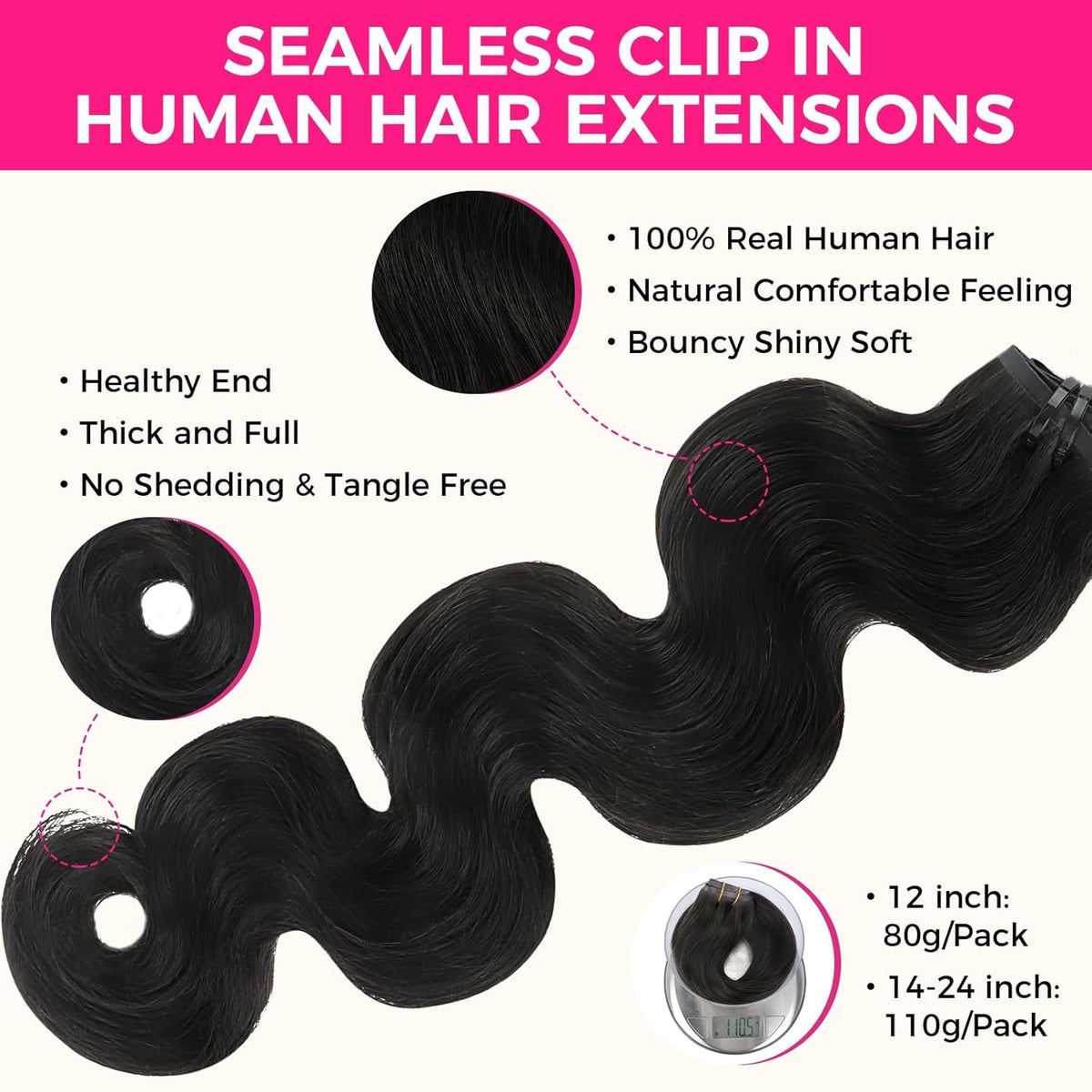 Encharm Seamless Clip In Body Wave Human Hair Extensions 1B# Natural Black Color