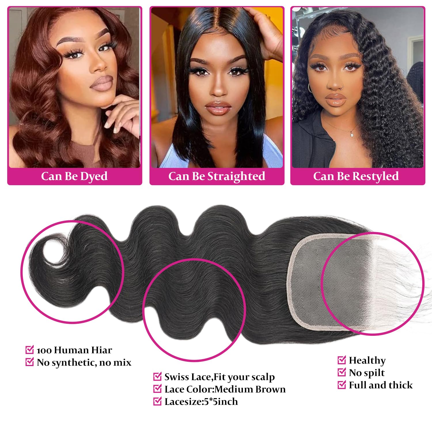 Encharm 5X5 HD Lace Frontal With Baby Hair Free Part 100% Virgin Human Hair Body Wave